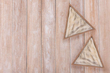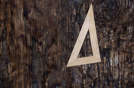 A light triangular ruler on a dark wooden background. A special geometric tool for drawing lines and measuring distances. Cracked wooden surface with cracks and splinters. top view. selective focus