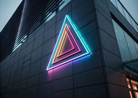 Three neon triangles are displayed on a rock surface against a deep black backdrop. The scene features vibrant blue and pink lighting, creating a modern, graphic style. The composition suggests an abstract, artistic presentation, suitable for conceptual visual projects. Ideal for use in design, advertising, and editorial content.