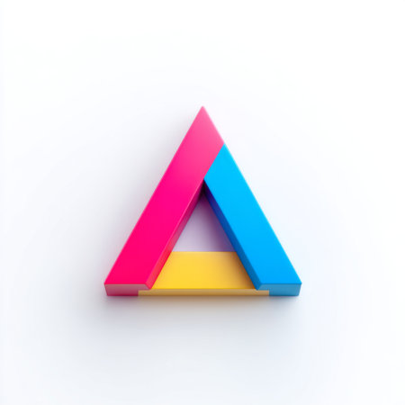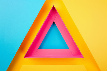 This vibrant abstract image features a triangle composed of three bright colors: pink, blue, and yellow. The clean white background enhances the vividness of the colors, creating a striking visual effect.