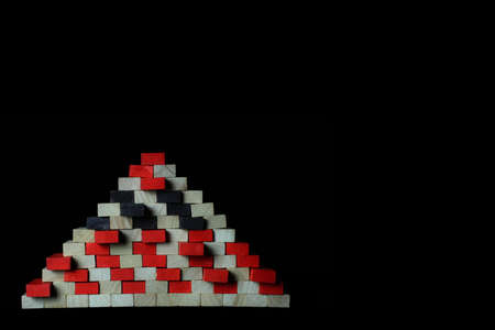 Pyramid of wooden bricks, black, red and beige on a black background. Copy space on the rigth