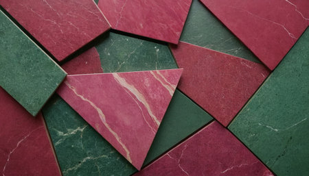 This image displays an enigmatic mosaic of geometric tiles set against a dark green backdrop. The depth and mystery of the dark green enhance the intrigue of the geometric patterns