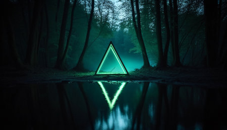 Mystical glowing neon creepy triangle or portal over water or lake in the forest, AI generated.
