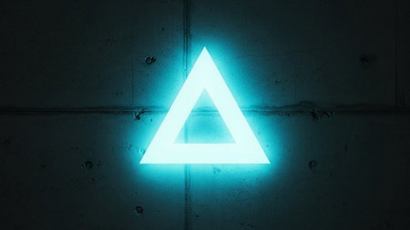 A stark, glowing cyan triangle is centered on a dark, textured concrete wall. The light emanating from the triangle creates a soft halo effect, contrasting sharply with the rough, uneven surface of the wall. The geometric precision of the triangle stands out against the organic imperfection of the concrete. The overall mood is modern, mysterious, and slightly futuristic, with a strong visual impact due to the bold contrast of light and dark, and the clean geometric form.