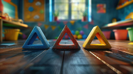 Three colorful triangular wooden blocks on a wooden floor in a playful room filled with vibrant decorations