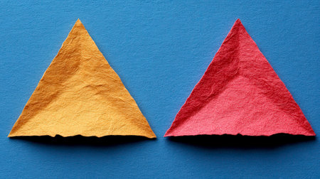 The photograph shows two equilateral triangles made of textured paper. The triangle on the left is a metallic gold color with visible creases and wrinkles, while the triangle on the right is a matte red with a slightly rough surface. They are positioned side-by-side on a textured blue background.