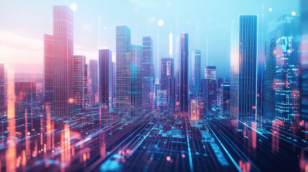 The urban skyline showcases towering buildings highlighted by glowing lights, with a vibrant overlay of digital patterns creating a futuristic atmosphere at dusk.