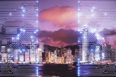Technology Internet of thing over the Hong Kong Cityscape skyscaper at the sunset time, Business Architecture and building with tourist concept, Technology smart city and internet of thing concept,