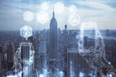 Double exposure of social network icons hologram and world map on New York city skyscrapers background. Marketing and promotion concept