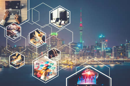 Double exposure of technology theme hologram and cityscape background. Concept of Hightech.