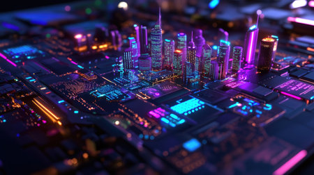 This captivating digital artwork features a futuristic cityscape constructed on a circuit board, illuminated with vibrant neon lights. Perfect for tech-themed projects.