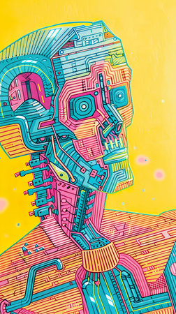A vibrant digital collage featuring a circuit board, glowing light bulbs, and a female face. The colors are bold and contrasting, creating a dynamic and energetic feel.