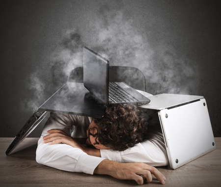 Stressed male freelancer is working at his laptop with smoke coming out from his head, depicting stress, anger management, deadline, time management and therapy