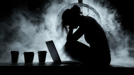 Silhouette of a woman sitting stressed with a laptop, large clock behind her, and coffee cups nearby, symbolizing overwork, time pressure, and exhaustion.