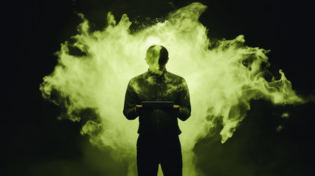 Mysterious silhouette of a woman surrounded by green smoke, capturing an ethereal and dreamlike atmosphere, ideal for concepts related to mysticism and spirituality