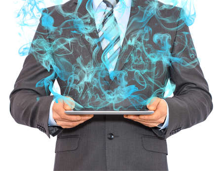 Businessman in a suit holds tablet pc with smoke The technology concept