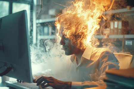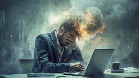 A man in a business suit with his head exploding into flames, symbolizing stress or burnout, set against a smoky background.