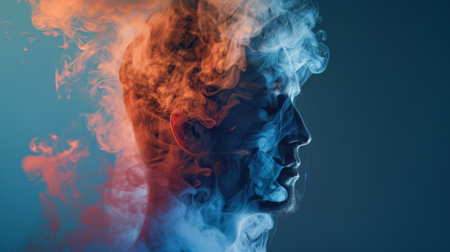 A profile of a man surrounded by swirling colorful smoke, creating a dramatic and artistic visual effect with vibrant blue and orange hues.