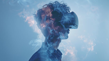 Wearing VR goggles using simulation device, double exposure on online cyber lifestyle.