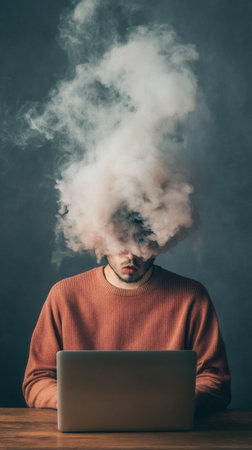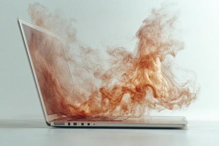 Swirls of brown smoke rise dramatically from an open laptop, creating a striking visual effect that blends technology and creativity. The minimalist setting enhances the focus on this surreal interaction of elements.