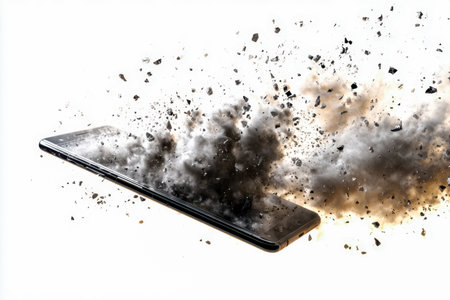 A shattered device bursts apart, with fragments scattering wildly, capturing chaos and energy in a dramatic, high-impact scene.