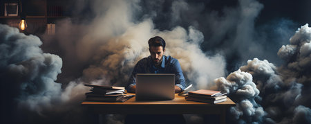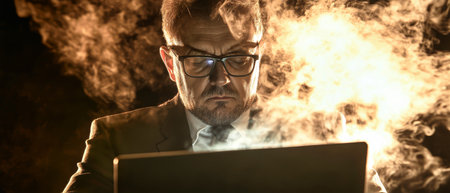 A businessman, clad in a suit and glasses, works intently on his laptop while smoke billows in a low-light setting.