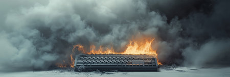 A keyboard is on fire, sending flames and smoke into the air. The intense flames and dark smoke create a dramatic contrast against a gray background, emphasizing the chaos of the moment.