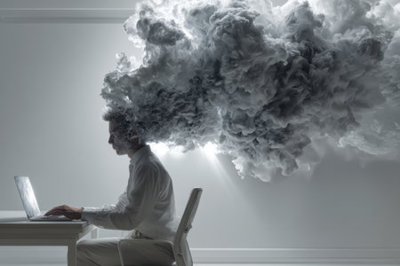 A person with a red glowing cloud head, covering their face with their hands, representing mental stress and overload.