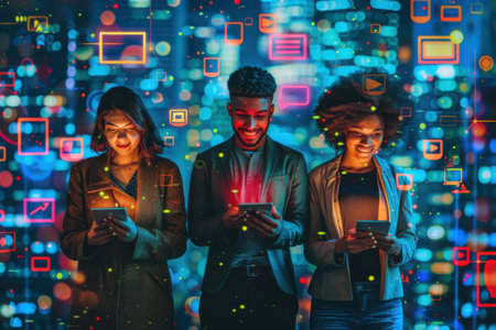 Group of Young People Using Smartphones While Standing in a Colorful Urban Setting During Evening Hours