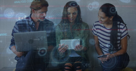 Image of data processing on digital screen over diverse female and male coworkers. Business, data processing, security, connections and technology concept digitally generated image.