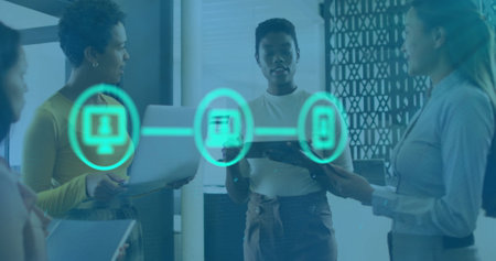 Image of network of connections with icons over diverse colleagues discussing work in office. Global business, finances, computing and digital interface concept digitally generated image.