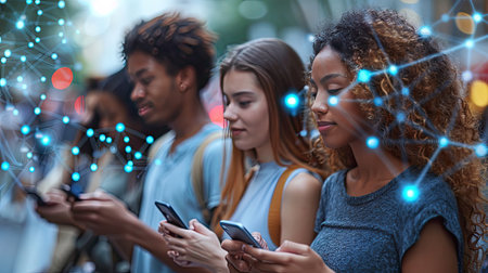 Double exposure of four young people using mobile phones together while standing together with connection network and night city background