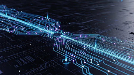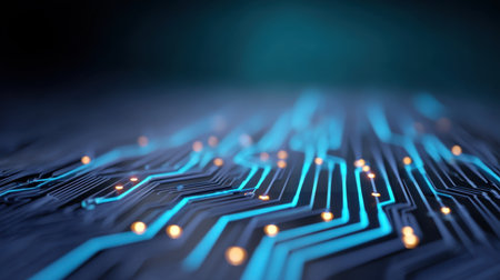 Intricate circuit board design glowing with data flow, macro perspective