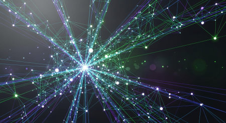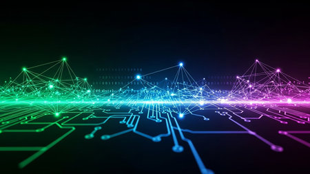 showing a futuristic digital network visualization with glowing neon lines in green blue and purple forming interconnected nodes and circuit board patterns...