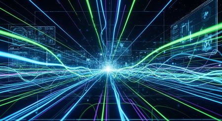 This image showcases a dynamic representation of data flow, visualized through vibrant, luminous lines. The artwork emphasizes the concept of connectivity and digital communication. Its style is modern and abstract, featuring a dark background that enhances the bright lines. This imagery could be used for various purposes, including tech-related presentations and marketing materials.