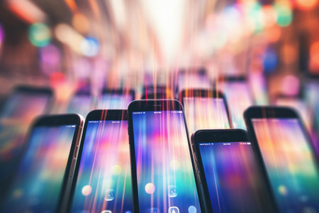 A smartphone emits brilliant light trails and colorful sparks amidst a lively digital landscape, showcasing technology's immersive power at night.