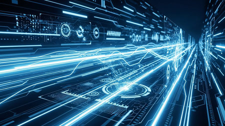 Representing showing abstract blue digital data stream with glowing lines and futuristic interface representing technology and information flow. resolution...