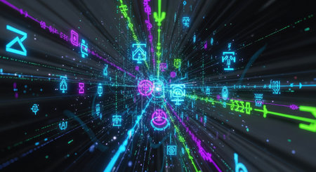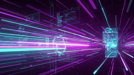 Immerse in an abstract digital landscape showcasing vibrant light rays and colorful particles, symbolizing speed, innovation, and energy in technology.