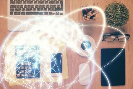 Double exposure of technology theme drawing over work table desktop. Top view. Global data analysis concept.
