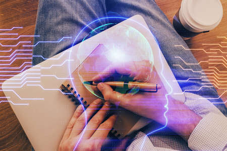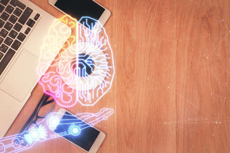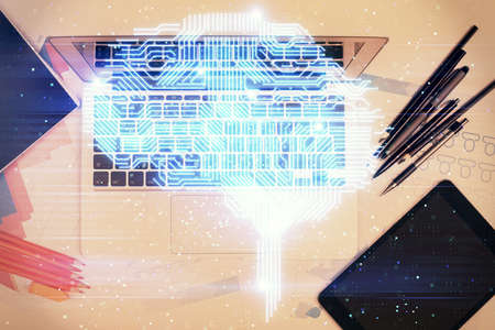 Multi exposure of brain sketch hologram over topview work table background with computer. Concept of big data.
