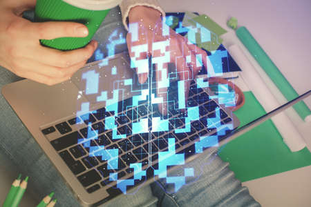 Double exposure of woman hands working on computer and data theme hologram drawing. Tech concept.