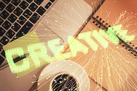Start up theme drawing over computer on the desktop background. Top view. Double exposure. Brainstorm concept.