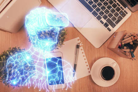 Double exposure of drawing man in AR glasses over table with phone. Top view. VR concept.