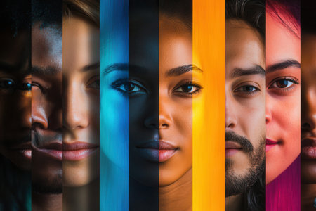dramatic collage of faces, different races and ethnicities, fostering acceptance and embracing diversity.