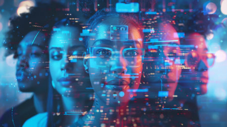A striking portrait features a diverse group of six individuals, creatively enhanced with colorful digital patterns and effects, offering a modern look.