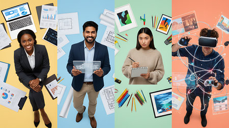 Overhead view of diverse professionals in business, architecture, art, and technology, symbolizing varied career fields and modern skills in a split-screen layout.