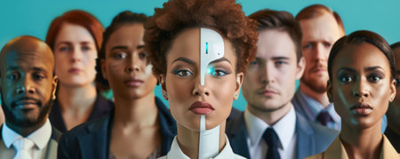 Diverse faces are visually separated by a barrier, emphasizing unique characteristics and the impact of bias on society.