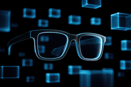 An artistic representation features wireframe glasses floating in a dark space, surrounded by glowing blue geometric shapes. The composition uses a digital, futuristic style with a focus on lines and light. The image may be suitable for illustrating technology, vision concepts, or innovative design.