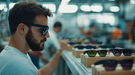 A man with a beard is seen from the side, trying on a pair of stylish sunglasses in a retail environment, focusing on his reflection or the fit.