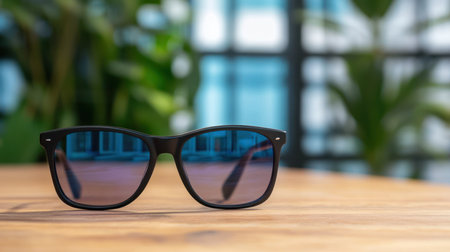 Stylish sunglasses with golden lenses reflecting a sunset road scene, placed on a wooden table in a contemporary interior