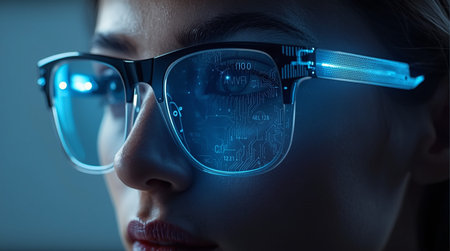 A close-up of a persons face wearing futuristic smart glasses, reflecting digital data. The image highlights the concept of augmented reality and advanced technology.